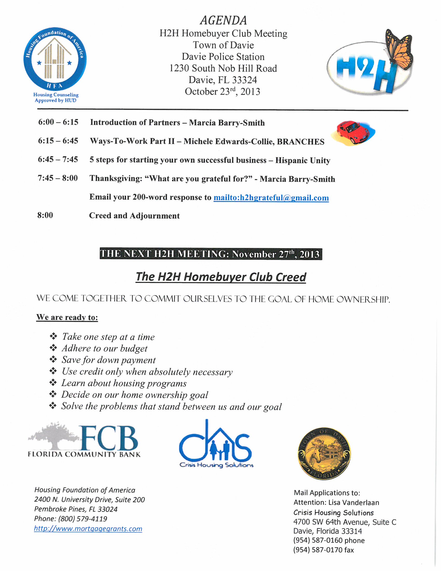 Click on “Read More” to view our agenda for the breakdown of tonight’s H2H First Time Homebuyer Club meeting.